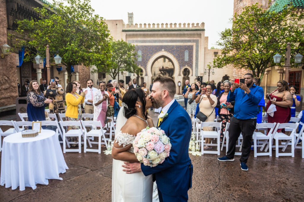 Disney world has the most magical venues, and our personal favorite is an Epcot Wedding! Sean and Danisha had their Fairy Tale Wedding at the Morocco Pavilion, and their reception was at Living Seas Saloon! If you’re planning to get married at Epcot, Morocco is an amazing Venue and The only pavilion built under the auspices of a government, Morocco is the most romantic and most authentic at EPCOT World Showcase, inspired by the North African cities of Casablanca, Fez and Marrakesh. When you first arrive in the “new city” area of the pavilion, your guests first view of the imposing Koutoubia minaret, a replica of Marrakesh’s 12th-century mosque. Stroll through a village filled with stunning mosaics, beautiful carvings and boutique treasures from this far-flung land. The Morocco Pavilion is Surrounded by citrus and olive trees, date palms and banana plants, the pavilion’s beauty is matched only by its stunning architecture of warm terra-cotta tiles and green-roofed buildings, designed by native Moroccan craftsmen. If you love Moroccan Architecture then this is the perfect venue for you!