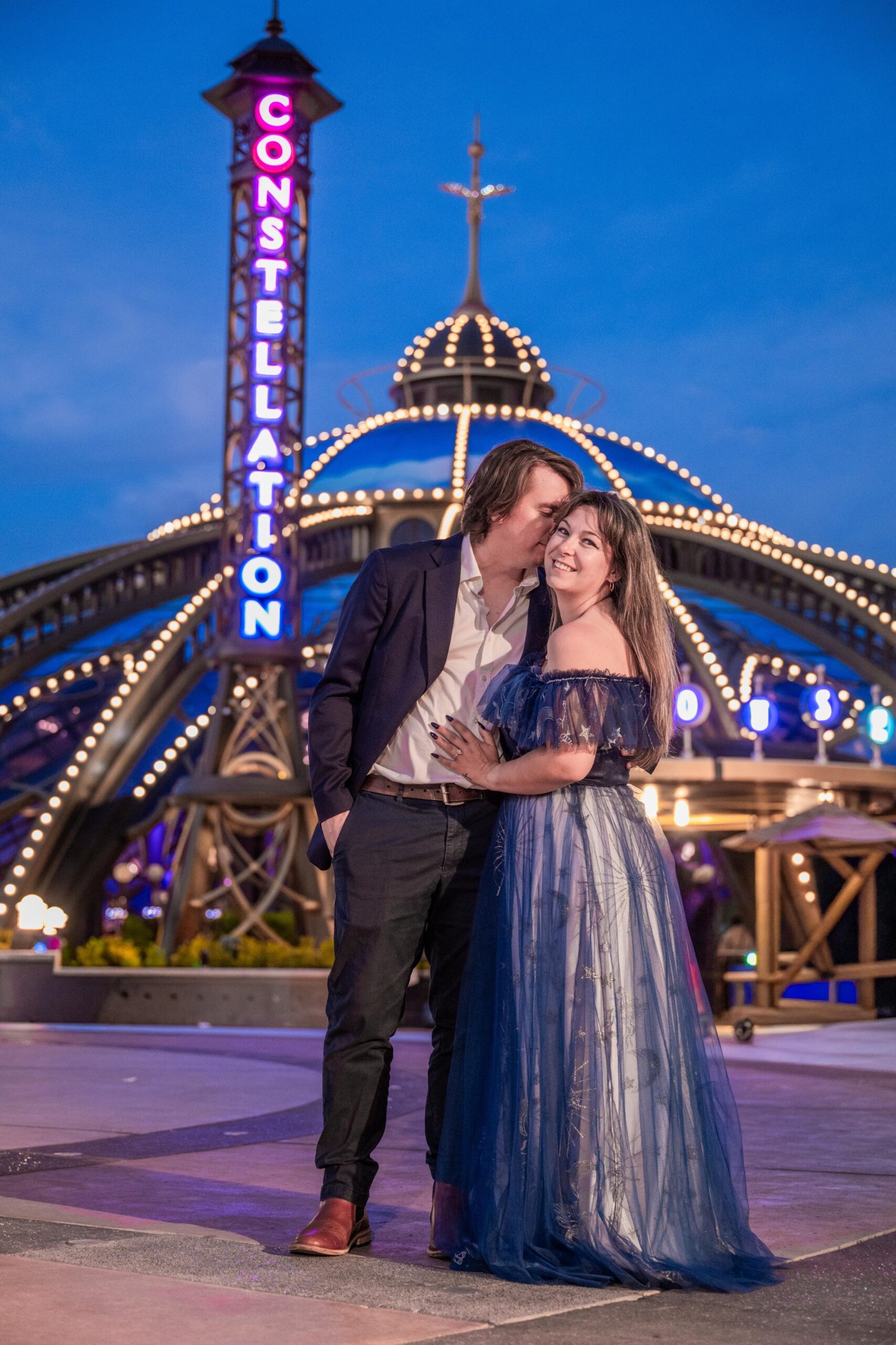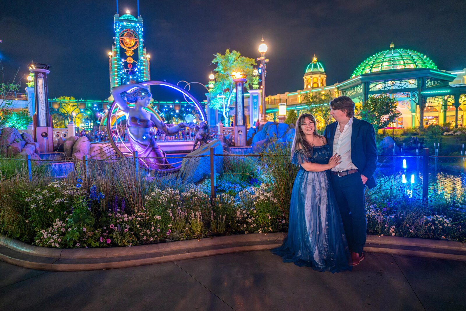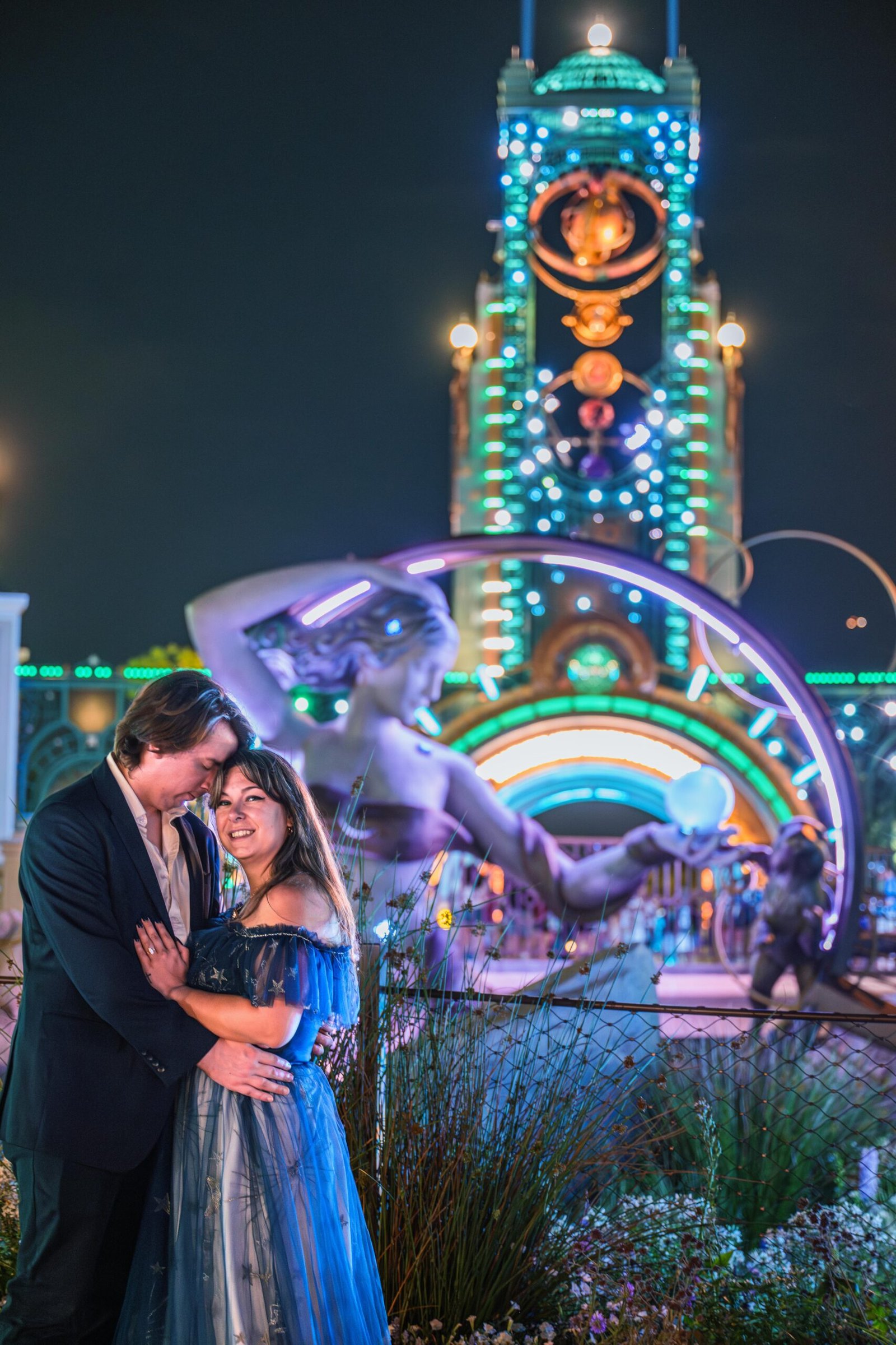 Nighttime is just as good—sometimes even better for a Grand Helios proposal—because most guests are inside the parks or at dinner. That means fewer people around and a more intimate setting. Plus, all the lights come on, giving your photos a vibrant, colorful look that really stands out.